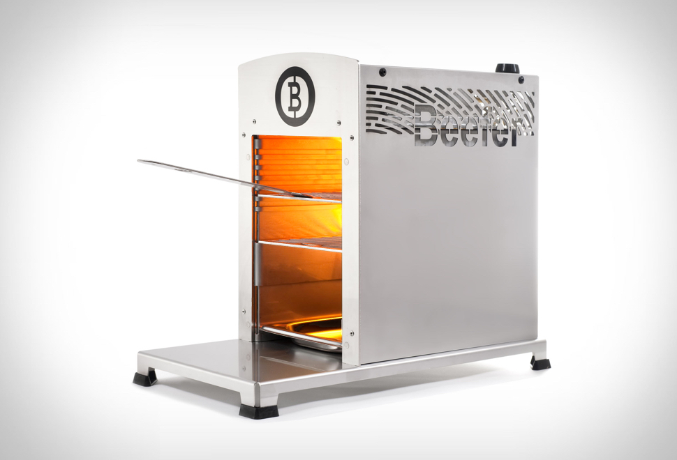 The secret to steak success in the best steakhouse restaurants is cooking it at 1,500 degrees under a top-down-fired, infrared burner. To replicate that sensational steak at home, you will need the Beefer high performance beef grill. Unlike gas or charcoal grills that only reach between 500 to 600 degrees, the Beefer uses top-down heat for that optimum temperature of 1,500 degrees. The Beefer is a compact, tabletop, stainless-steel cooker with a top-down-fired, infrared, ceramic burner, and a height-adjustable grilling grate. It cooks quickly and evenly to a perfect juicy doneness, and sears flavors in, creating a crispy, caramelized crust on meat in seconds. The tray below stops juice and fat from draining, which you can use to make delicious sauces. watch the video below