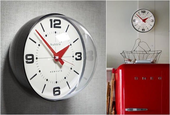 The Bubble, available at Westelm, is an original Wall Clock part of the Newgate Clocks collection. With a 70s retro design, it features bold, large numbers and tapered hands. The clock is available with a Black or a White dial and has a Gloss-finished casing for eliminating potential glare.