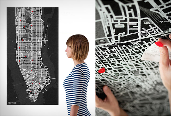 Pin City Wall Maps are a contemporary take on the classic push pin maps. Designed by Alessandro Maffioletti and Emanuele Pizzolorusso, the maps are printed on flexible felt panel, and can be used to pin your favorite spots in the city. You can choose from some of the most important cities, London, New York, Paris, Amsterdam or Berlin, a World Map is also available. Every map is available in black or blue and contains 15 pins(extra pins available for purchase).