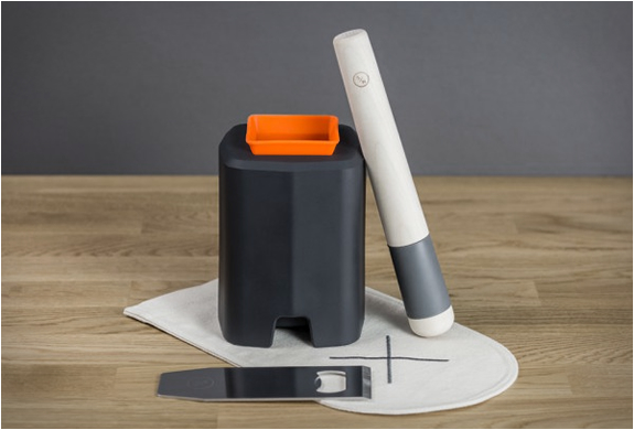 The Neat Ice Kit by Studio Neat is a unique set of tools for creating perfect ice for your at-home cocktails. Create a huge, crystal clear cube for drinks like the Old Fashioned, smaller clear chunks for drinks like the Tom Collins, or even crushed ice for drinks like the Mint Julep. The fancy kit ads a really fun step to making a cocktail, it includes an insulated ice mold, a chisel that doubles as a bottle opener, an old school Lewis bag and a wooden club to crush ice. watch the video.
