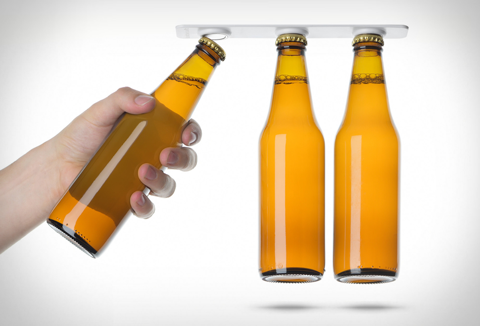 Do you have difficulty managing space in your fridge? Always running out of fridge space for your beer collection? BottleLoft can definitely come in handy. The ingenious contraption saves you a lot of space by simply attaching your bottles to the interior ceiling of your fridge! Each strip utiizes 3M VHB (very high bond) adhesive to securely attach to your refrigerator ceiling, and can hold 3 standard 12 oz bottles by their cap alone. Two strips are included with each BottleLoft pack, allowing you to magically levitate an entire six pack of beer in your fridge. watch the video below