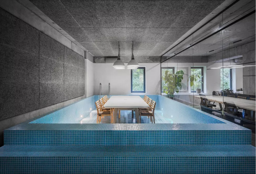 Our office crush this week is located in the historical district of Kyiv, Ukraine. This extravagant workplace is home to creative agency Banda, whom commissioned architects Balbek Bureau a comfortable working space suitable for an artistic soul. Designed to make its employees feel as if they could be anywhere but not at work, the funky office features an extraordinary meeting room in the form of a swimming pool, a vibrant bar area, a detached in-built barn-house, vintage retro furniture, and spacious working areas that encourage interactions and the exchange of ideas. Designed in minimalist style with an industrial look, the entire office feels open and light, allowing employees to move between various spaces which eliminates the sense of lassitude and stimulates creativity.