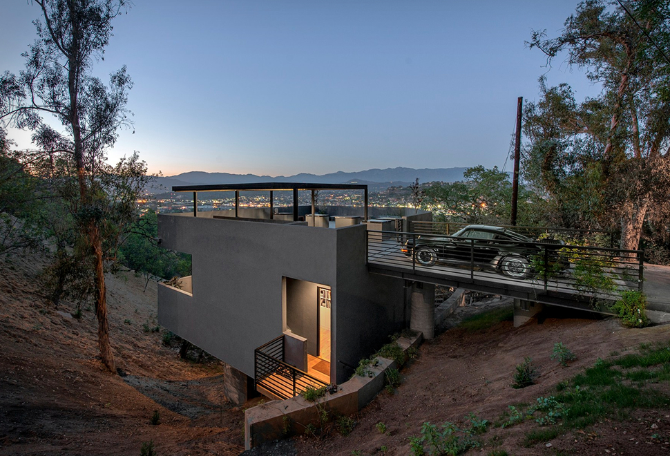The spectacular "Car Park House" is a private residence designed by Anonymous Architects, with impressive views of Los Angeles, California. The daring architecture concept was born from the crazy idea of literally driving your car on the roof of your house. The contemporary house sits on a very steep down-slope from the street, and is designed to float over the hillside. This reduces the amount of foundation required and also means that the only way to access the house is over the bridge. The roof has parking for two vehicles, and has a deck space with sweeping views of the city below.