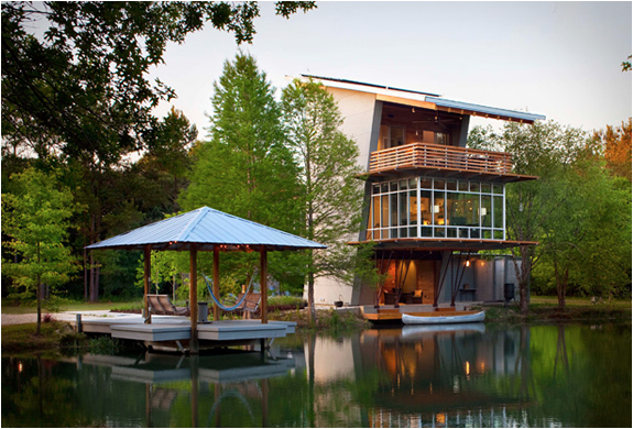 The Pond House is a magnificent retreat designed by Holly & Smith Architects. Located at Ten Oaks Farm in Hammond, Louisiana, the beautiful retreat is a 1,250 square foot, net zero energy house that sits over the edge of a stunning pond and overlooks a peninsula of ten oak trees that stretch out into the middle of the pond. The house is completely open with panoramic views to the surrounding landscape, the ground floor features an outdoor area that includes a fireplace and outdoor kitchen, that are perfect for entertaining family and guests.