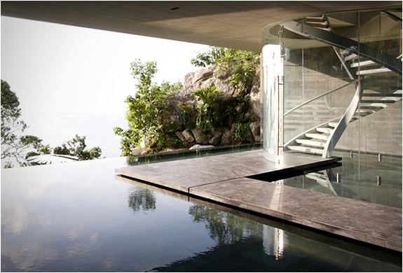 Tierra Design Studio are responsible for this stunning modern house on the west coast of Phuket, Thailand. Villa Mayavee has impressive panoramic views over the Andaman Sea and surrounding hills. The design is simple but with a modern and artistic look. The spiraled staircase is one of the many interesting features, it leads you to the pool and terrace you can contemplate the amazing views.