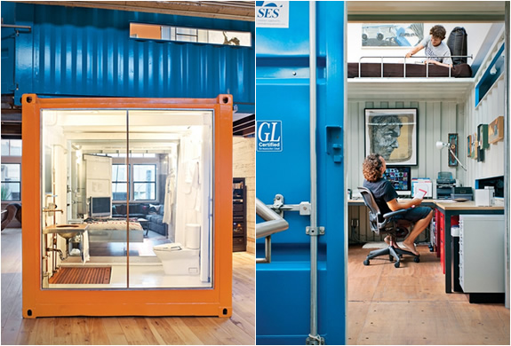 This original open-space living/work loft is the creation of two San Francisco art and travel addicts, Jeff Wardell and Claudia Sagan. They bought a 3,200 sq ft former Chinese laundry and restored it as a living space. They also wanted to include a home office and a guest bedroom without cluttering the space, so they came up with the idea of stacking two shipping containers on top of each other to create private space within the open-plan living area. source