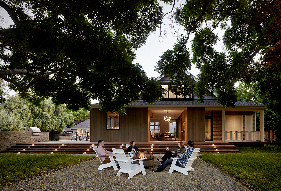 Designed by the Bohlin Cywinski Jackson architecture studio, this stunning country farmhouse is located in Napa Valley, California. The talented team transformed what was once a dated and dark farmhouse, into a bright and airy contemporary home surrounded by grape vines and matured walnut trees. The renovated farmhouse now features an open living room and dining area (with beautiful cedar siding on the ceiling and walls) that look out to an expanded deck, a rectilinear pool, a guesthouse, and a renovated water tower. The yard includes numerous opportunities for entertaining, including a built-in barbecue, fire pit, and bocce ball court, with views of the vineyards beyond.