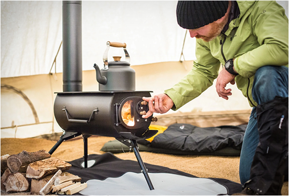 Frontier Plus Stove aims to be the next generation cast iron wood burning stove. It´s lightweight, portable, with mounting feet that you can dismantle, and has a flue system that you can use to heat and cook in a tent, a cabin, van or just plain outdoors. The included flashing kit enables you to install the flue system, quickly and safely, you get classic and effective warmth and sustainability because it uses the most ancient fuel on earth - wood. The Frontier Plus Stove breaks down and packs away inside the body, and the handle on the side does add the needed portability. Control the temperature through the vent aperture and check the flames through the glass window. Old school cast iron and wood burning available today. watch the video