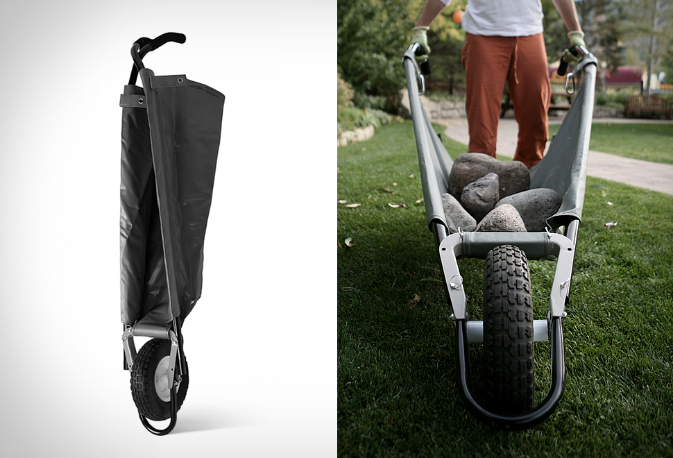 WheelEasy is a compact and collapsible yard cart that can carry 350 pounds of cargo! The cleverly designed WheelEasy works exactly like any normal wheelbarrow, but instead of a metal container, the sturdy front wheel and handles support a basin made of durable, vinyl-coated canvas that supports up to 350 lbs. It is also great to load things onto, because it spreads flat on the floor, so no more lifting a heavy, wobbly wheelbarrow. And when your done, it will fold up, so that you can hang it up in your garage, taking up very minimal space.
