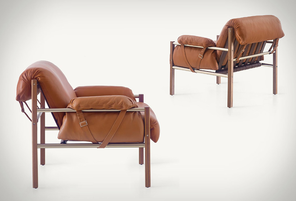 The Sling Club Chair is a beautiful piece of furniture designed by the guys at BassamFellows. It has the ideal balance, blending a minimal geometrical form with organic premium materials, and mixing the cold industrial steel with natural warm leather and walnut wood. This perfect combination is assembled by highly competent craftsmanship, making this piece into something close to a work of art. Form and function are present, comfort and look also combine in a chair that will be the highlight in any room you put it into. The down feather cushioning along with dual density foam assure you’ll have a cloud like feel when sitting on it and the smooth soft leather grain will wrap you in a silky mood that will get you into a zen state real quickly.
