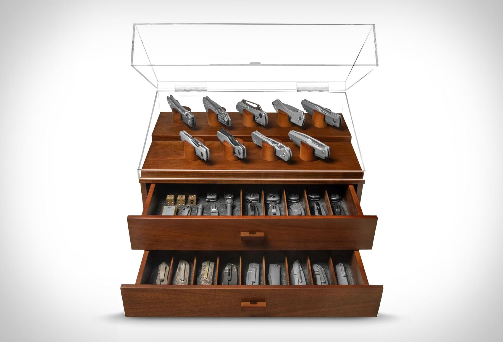 Showcase your 9 prized knives on felt-lined pillars beneath a clear acrylic lid, offering stunning 360-degree views. Store an additional 30-40 knives in felt-lined drawers that glide effortlessly on metal rails. Designed with EDC enthusiasts in mind, the Armada protects your collection from dust and scratches while adding a touch of luxury to any space.