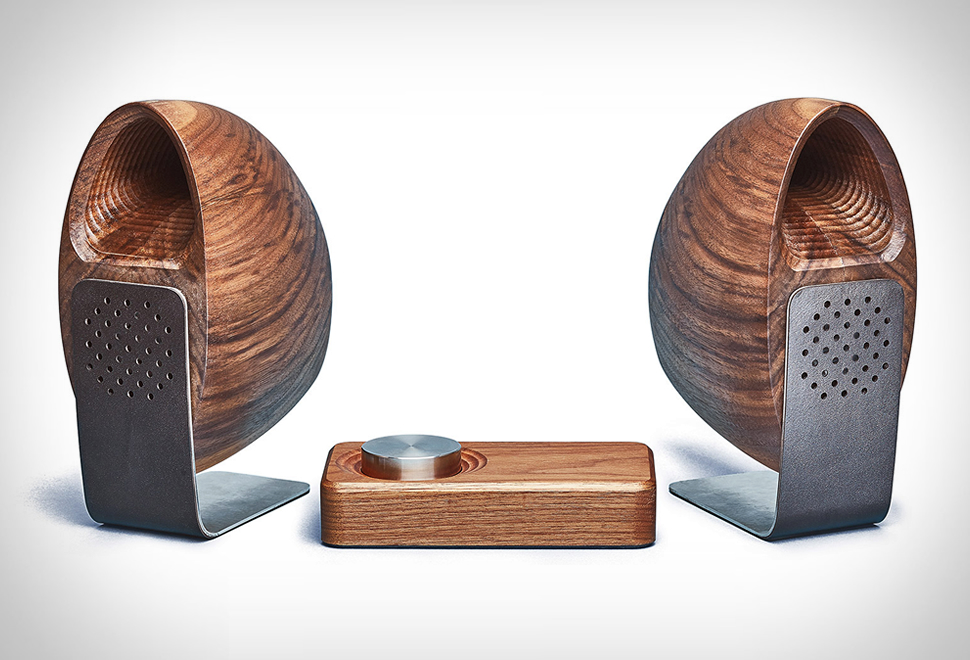 Portland-based workshop Grovemade have teamed up with industrial designer Joey Roth (creator of the celebrated Ceramic Speaker System) for this beautifully-crafted speaker system. Combining Grovemade´s design language with Roth´s experience in audio speaker design, the end result is a piece that is timeless, elegant and wholly unique in character capable of delivering an acoustically rich sound. Crafted one at a time, the wood shell on each speaker requires hours of CNC machining and skilled hand forming, leaving the interior without any parallel walls or flat surfaces, eliminating distortion. Dual 25-watt amplifiers power 2-inch full-range driver in each speaker, while the back-loaded horn is designed to create more powerful lows. Available now in a choice of Walnut or Maple.