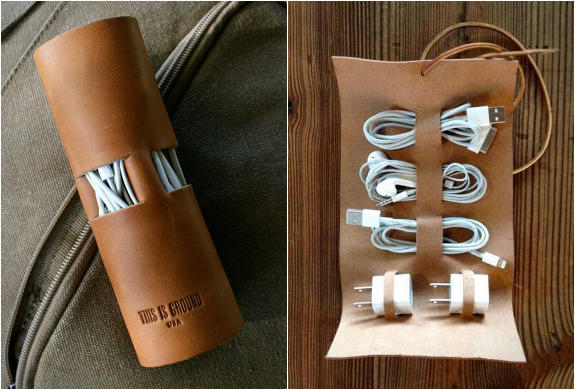 There are some great products on Etsy, our latest crush is this stylish Cordito Cord & Plug Organizer made by Mike Macadaan from "This is Ground" shop. It is made with premium leather and neatly holds your cords, earbuds and plugs in one piece of leather that can be rolled up and snapped shut like a burrito. Available in black or tan. via