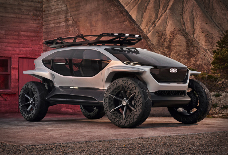 Audi have shown a preview of their future emission-free off-roader, the spectacular Audi AI:Trail Quattro. The study takes the shape of a futuristic, buggy-style four-door vehicle with a fully electric powertrain, incorporating four electric motors for a driveshaft-free all-wheel drive. The all-electric vehicle encloses its passengers in a glass bubble, and features massively knobby tires that appear to be from an off-planet vehicle. A large lithium-ion battery provides a range of between 248 and 310 miles at a single charge. It drives emission-free thanks to four electric motors and a quattro drive that offers a 429 horsepower output, 320 kilowatts of power, and over 737 lb-ft of torque to help it traverse any terrain you can throw at it. It also boasts a number of automated systems like rooftop-mounted drones that replace the headlights and Level 4 autonomous driving.