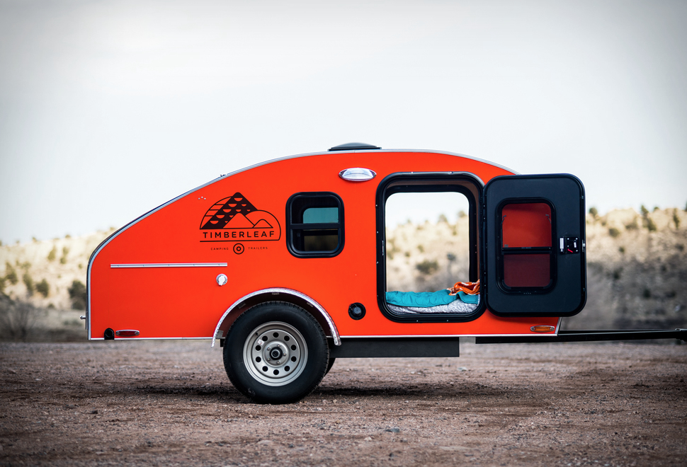 The Timberleaf Camping Trailer is a great way to explore everything the backcountry has to offer, it can easily be towed by any passenger vehicle and is perfect for campers looking to slim down their summer payload. It weighs in at under 1,200 pounds yet still offers everything you need for a short stay in the wilderness, cozy sleeping quarters with a queen mattress, plenty of storage, and a massive skylight that allows you to literally sleep under the stars. There is also a rear hatch that opens for access to the handsome birch galley with sink, birch cooler, and colorful countertops.