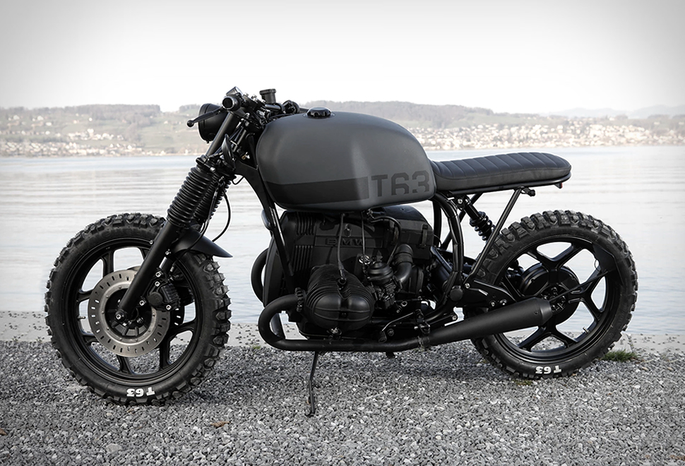 Angry Motors is a new custom motorbike workshop from Switzerland, their first build is this spectacular 1989 BMW R80RT scrambler called "T63”, a name that origins from the bike´s chunky Michelin T63 tires. This model was chosen for the striking mono-shock on the rear, and the iconic boxer engine. The whole bike was ripped to the bone and all parts were powder coated, spray painted, and then rebuilt it completely with new seals, stainless bolts and bespoke pieces. It was also fitted with a custom leather seat, retro grips, montone handlebar controls, YSS rear shocks, bing carburetors, and finished in a sublime matte black color scheme.