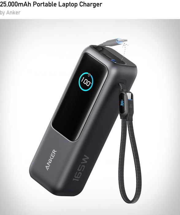 Power your gear anywhere with the Anker Laptop Power Bank, a compact 20,000mAh powerhouse built for multi-device charging. It features a retractable USB-C cable, 100W output for laptops, and smart power distribution for phones, tablets, and more, all wrapped in a sleek, travel-ready design.