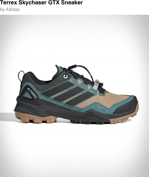 Adidas Terrex Skychaser GTX sneakers are built for all terrain hikes with dependable traction and waterproof Gore-Tex protection. The lightweight yet supportive design combines rugged outdoor capability with sneaker comfort, making them a versatile choice whether you are tackling muddy trails or walking city streets in wet weather.