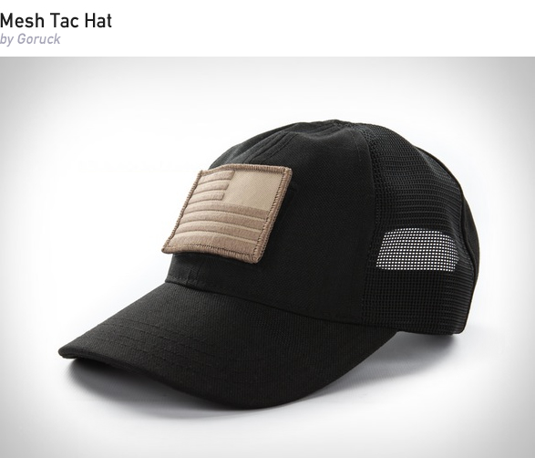 GORUCKs Mesh TAC Hat pares the military tactical hat down to its essentials while keeping the secure, low profile fit. The middle panels are made of a non-stretch mesh which allows more air to flow, keeping your head cool even in warm weather. The front and brims underside feature a 2” x 3” Velcro spot to attach the included American Flag patch, or others from GORUCK.