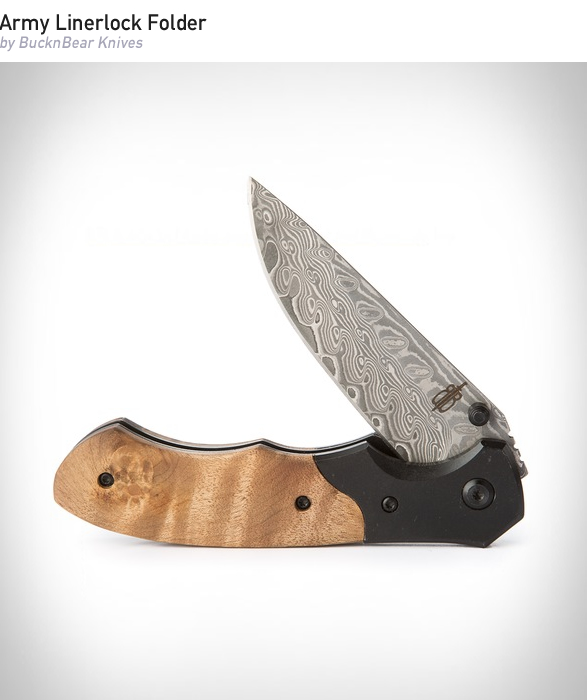 BucknBear holds true to three key principles to produce some of the best knives around. The black stainless steel bolsters combine with burled wood handles make the Army Linerlock Folder a handsome knife that’ll draw compliments every time you pull it out.