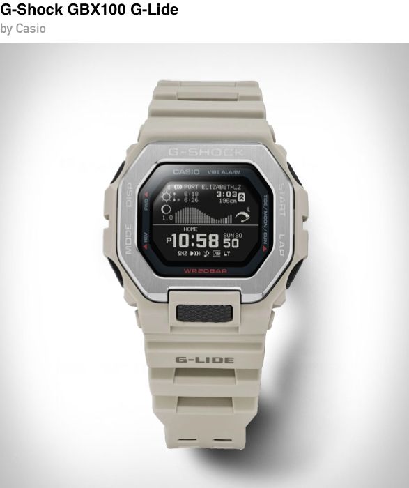 Designed with surfers in mind, the G Shock G Lide GBX 100 features tide graphs, moon data, and sunrise and sunset information pulled via Bluetooth from your phone. The high contrast MIP display stays clear in bright light, while the shock resistant and water resistant build handles salt, sand, and impact with ease. A solid tool watch that works just as well off the water.