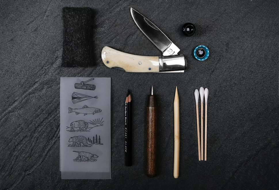 Scrimshaw is an early American art form originating from the whaling industry in the late 1700´s. This Scrimshaw Knife Kit takes you back in time to when men scribed storytelling images into whale teeth and buffalo bone. You can experience this art form too as you scrimshaw the images of a hunt, big catch or simply the family name on your very own bone-handled pocket knife. This kit includes all you´ll need to complete the project and is a perfect starter introduction into scrimshaw. Whether you choose a classic sporting scene, phrase, or your initials, no other knife will be quite like yours.
