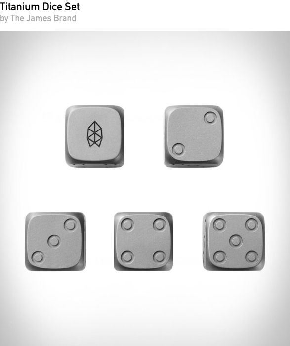 A set of precision-machined dice crafted from titanium by The James Brand. Lightweight yet durable, these premium dice are great for tabletop gaming or as a thoughtful gift for role players and collectors.