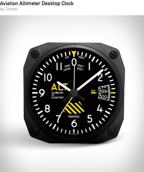 A desk clock styled like an aviation altimeter instrument. With a bold dial and aviation inspired design, it brings cockpit character to desks, shelves or offices while keeping time in a distinctive way.
