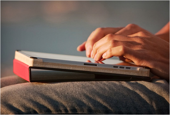 This is the DODOcase, it very much resembles the moleskin agendas, its made from faux leather and constructed using traditional book binding techniques, the are designed to fold back so you can stand your iPad, and an elastic strap keeps your iPad sealed tight when you are on the go. The interior from the highest quality bamboo and is carved carefully to match the curvature of your iPad and give you access to all buttons and ports. It will keep your iPad protected and you looking good.