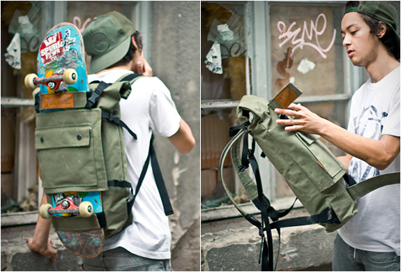 Another awesome bag by Hungarian bag manufacturer Blind Chic. Scumbag is the result of a unique collaboration of Blind Chic and Lokál Skateshopis (shop owned and run by skaters, in Budapest). During the design process Blind Chic involved the skaters to help them create a functional design for city commuters/skaters/riders. The result is a Roll-top backpack made from waxed cotton canvas that features a front panel attached by 4 front and side buckles. This detail allows for a skateboard or other object to slide in between the panel and the bag. It also features a rolled Velcro enclosure on top to expand the size of the bag. Watch the video