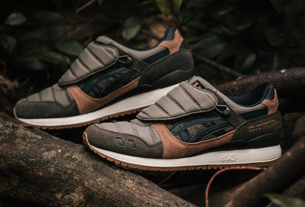 Asicstiger has teamed up with Singapore-based footwear retailer Limited Edt and Singapore´s OG sneaker artist, Mark Ong, to roll-out the highly-anticipated GEL-LYTETM lll shoes – Monsoon Patrol. Made to conquer any inclement weather, the special edition GEL Lyte 3 is equipped with a triple-density sole, nylon toe box, gutter hook system, and removable shroud. The split tongue classic is completely rebuilt to withstand any harsh conditions. The cool sneaker comes in a green colorway, offset with camouflage hits and light brown suede panelling.